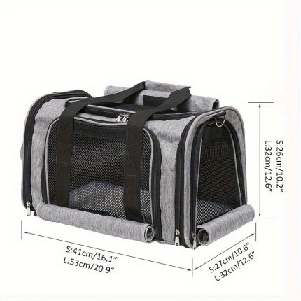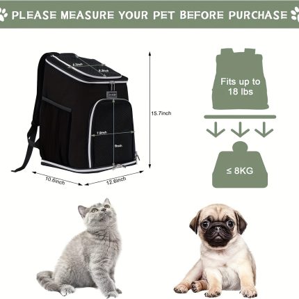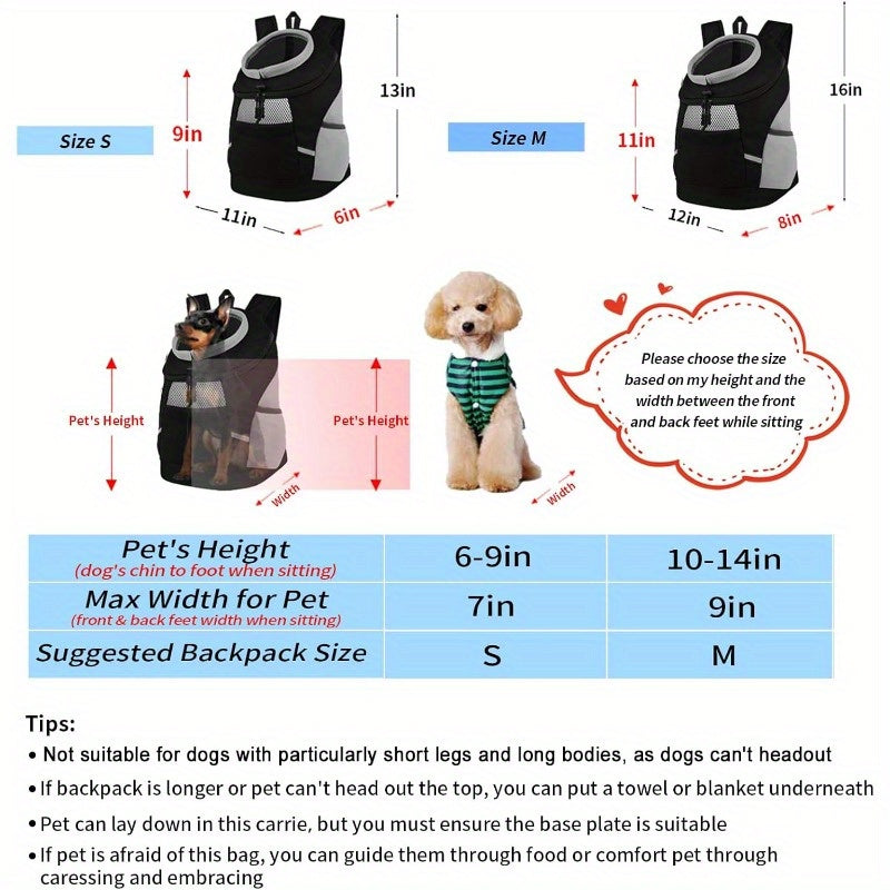 The dimensions of the dog carrying backpack are as follows: Size S measures 13 inches in height, 11 inches in length, and 6 inches in width. When sitting, the height from the pet’s chin to its feet should be between 7 to 10 inches, and the maximum width from the front to the back feet should be 7 inches, with a recommended weight limit of 6 pounds for pets. It is advisable to measure your pet prior to making a purchase. The backpack is constructed from durable, breathable mesh material, ensuring comfort and ventilation. The design allows the dog’s head to stick out, facilitating easy breathing and communication with you.