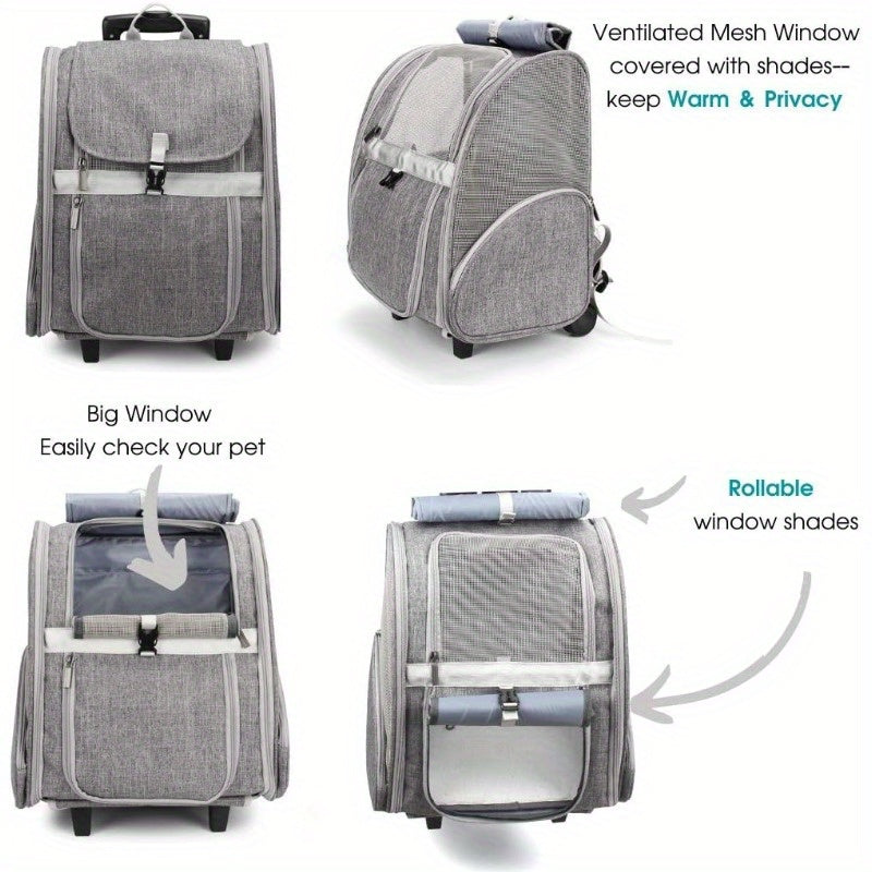 Versatile Pet Backpack: This dual-function pet carrier comes with a mat and a soft blanket, transforming into a backpack, wheeled carrier, car seat, and pet bed, so you can take your beloved pet with you anywhere. Airy Structure: The three-sided mesh design promotes airflow and lets your pet see outside, making long journeys more comfortable and safe for them. Handy Additions: The retractable window covers offer warmth and seclusion, and the strap storage compartment keeps the backpack organized.